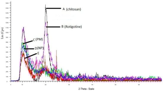X-ray diffraction of (A) chitosan, (B) rotigotine, (C) physical mixture (drug + polymer), (D) drug loaded NPs, and (E) placebo NPs.