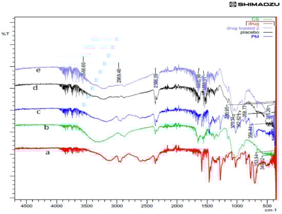 FTIR spectra of (a) rotigotine, (b) chitosan, (c) physical mixture, (d) placebo CS NPs, and (e) rotigotine-loaded CS NPs.