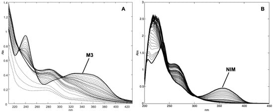 Due to the low solubility in water, the photodegradation of the tested compounds was first executed in ethanol solutions, at a concentration of 20.03 and 20.11 μg mL−1 for M3 and NIM, respectively, as above described. These solutions were placed in quartz cuvettes and subjected to stressing light. The absorbance spectra from 200 to 450 nm were recorded before the experiment (t = 0 min) and at time intervals up to 7 h of exposure. Figure 2 shows the sequences of the recorded absorbance spectra of M3 (Figure 2A) and NIM (Figure 2B).