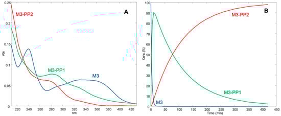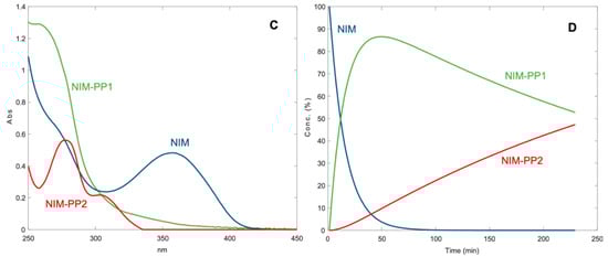 The results from MCR analysis are shown in Figure 3. The elaboration of the data assumed the formation of two photoproducts for both compounds. The predicted absorbance spectra and the concentration profiles of the photoproducts of M3, namely M3-PP1 and M3-PP2, are shown in part A and B of Figure 3, respectively. In the same Figure, the spectra (C) and concentration profiles (D) for NIM and its photoproducts, NIM-PP1 and NIM-PP2, confirmed the results reported in the literature [19,25].