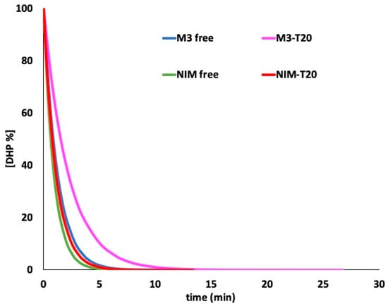 The prepared micellar solutions were then subjected to the photodegradation test. When the MCR technique was applied to the spectra from the degradation experiments, the same photoproducts detected during the light exposure of the ethanol solutions were detected. The kinetic parameters showed a clear decrease in the photodegradation rate, demonstrating a higher stability of the compounds entrapped in the micelles with respect to the free drugs. The t0.1 value calculated for M3-T20 and NIM-T20 were 5.05 and 2.52 min, respectively, as reported in Figure 5 and listed in Table 1. The persistent light sensitivity of the DHPs was probably due to oxidation reactions, favored by the water environment.