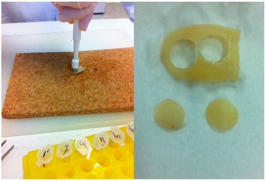 Following this, each hallux hail was treated with a sterile punching device (0.9 cm in diameter; Medical Train, Madrid, Spain) to obtain two identical 0.9-cm-diameter nail discs derived from each nail. One disc from each nail was added to the “perforated” group and one to the “unperforated” group to minimize variability (Figure 1). The thickness of each hallux nail disc was measured using a digital caliper with a resolution of 0.01 mm and an accuracy of ±0.04 mm (Calibre Digital DCP 500; PCE Iberica S.L., Tobarra, Albacete, Spain).