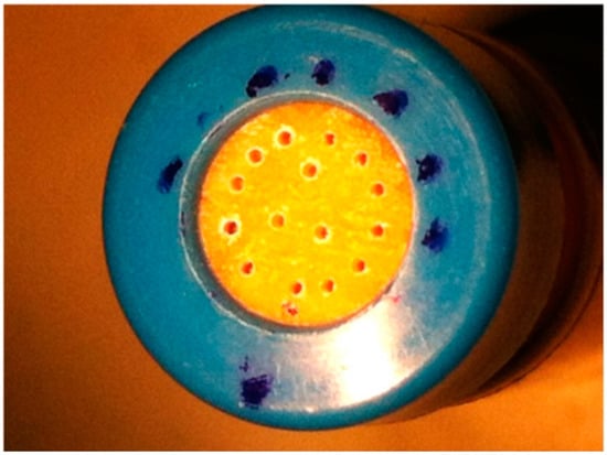 After this, the 12 nail discs in the “perforated” group were each drilled with 16 holes (Figure 2) using the Clearanail® device (Medical Device Treatment Ltd., Brighton, UK; www.clearanail.com), whilst the unperforated group nails were left intact. The Clearanail® device is a nail drill consisting of a motor unit and handle fitted with a single-use 0.4-mm carbide micro cutter. This nail drill is capable of quickly making holes in human nails, but automatically stops once it is through the nail plate to ensure that it does not damage the underlying soft tissue of the nail bed. Holes were drilled only at the start of the study.