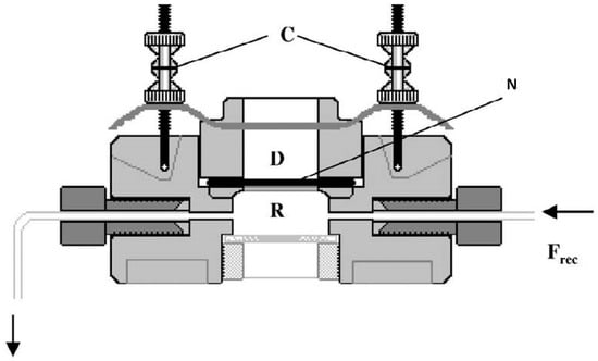 Schematic diagram of a flow-through diffusion cell: D, donor compartment; R, receptor compartment; N, nail; C, clamping system for the donor chamber; Frec, flow of receptor fluid.