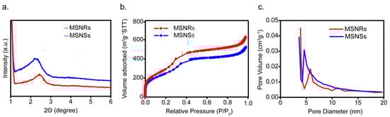 The small-angle XRD patterns of MSNs are shown in Figure 2a. MSNRs presented a maximal peak at approximately 2.4°–2.5° 2θ, indicating the formation of the mesostructure, which was in good agreement with the TEM images (Figure 1). For MSNSs, a broader peak was identified at approximately 2.2°–2.3° 2θ, demonstrating that this mesostructure was less well-ordered than that of MSNRs [33,34].
