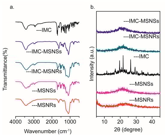 FTIR spectra (a) and XRD patterns (b) of IMC, IMC-MSNRs, IMC-MSNSs, MSNRs, and MSNSs.