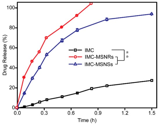 Release profile of IMC-MSNRs, IMC-MSNSs, and IMC. Statistical significance is represented by ** p < 0.01.