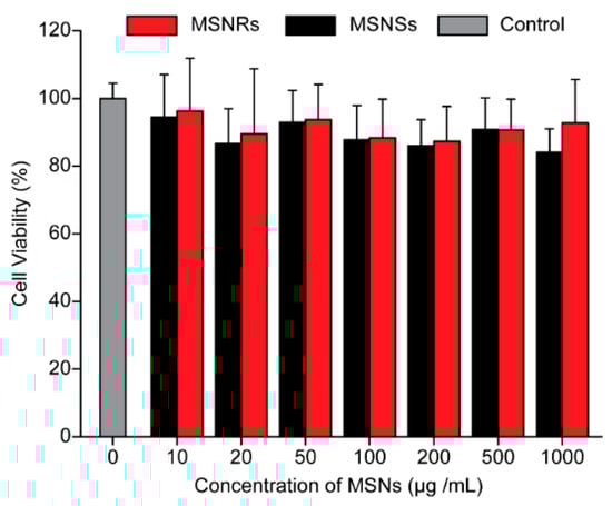 Viability of Caco-2 cells after incubation with naked MSNRs or MSNSs for 24 h. Control group: DMEM medium without serum (mean ± SD, n = 3).