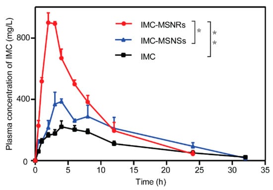 All procedures in the in vivo pharmacokinetic study were carried out according to the Guidelines for Animal Experimentation of Shenyang Pharmaceutical University (Shenyang, China) and with the approval of the Animal Ethics Committee of the institute. Male Sprague-Dawley rats (body weight 200 ± 20 g) were randomly divided into three groups (n = 3 for each studied group). Prior to the experiments, the rats were fasted overnight with free access to water. Aqueous suspensions of IMC-MSNRs, IMC-MSNSs, or IMC at 40 mg/kg were orally administered, respectively, and blood samples (0.5 mL) were collected at predetermined time points (0.5, 1, 2, 3, 4, 6, 8, 12, 24, and 32 h) in microcentrifuge tubes containing heparin by retro-orbital venipuncture technique. The blood samples were immediately centrifuged (10 min, 5000× g) and the supernatant was collected for the HPLC analysis of IMC.