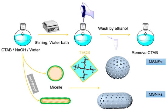Preparation of mesoporous silica nanospheres (MSNSs) and mesoporous silica nanorods (MSNRs).