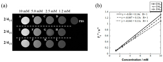 The mixed micelles 2/4n (Figure 1) were prepared at a concentration of 10 mM for each component in the PBS according to the procedure described in the Supplementary Information. The stability of the micelles was found to depend on the length of the alkyl chain (n = 14, 16, and 18) in the radicals 4n (Table 1 and Figure 2). The 2/416 and 2/418 were formed as a clear dispersion immediately after preparation and their mean diameter gradually increased up to 92 and 45 nm after one week, respectively (Table 1). The micelle 2/414 collapsed within one day to give white precipitates of 414 after 24 h. From these results, summarized in Table 1, the relative stability of the micelles 2/4n in PBS was in the following order: 2/418 > 2/416 > 2/414. The similar dependence of the micellar stability on the alkyl chain length in the nitroxide radicals 4n was also observed in the cases of the mixed micelles 1/3 and 2/3 [18,19]. The mean diameters of the resulting magnetic mixed micelles 2/4n in PBS were determined to be 13 to 16 nm by DLS analysis (Table 1 and Figure 2). Their mean diameters fell in a range of 10–100 nm, which is required for the most prolonged blood circulation time.