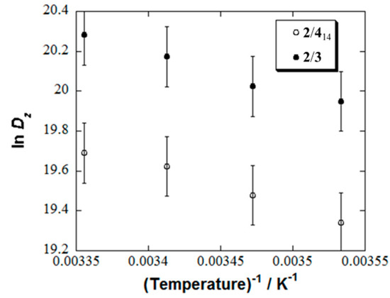 Temperature dependence of rotation diffusion coefficient Dz of 414 in 2/414 and 3 in 2/3. The data of 2/3 was cited from reference 19. See the Supplementary Information for experimental details of 2/414.