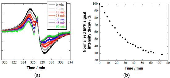 The concentration of ascorbic acid in the healthy adult serum was reported to be kept in the range of 14.9–52.8 μM by a daily intake of ascorbic acid (60 mg) [32]. When nitroxide radicals were applied to the in vivo MRI measurement, radical reduction occurred and resulted in a significant decrease in the MRI contrast [33,34,35]. For example, 2,2,6,6-tetramethylpiperidine-N-oxyl (TEMPO) derivatives, such as 4-oxo-2,2,6,6-tetramethylpiperidine-N-oxyl (TEMPONE) and 4-hydroxy-2,2,6,6-tetramethylpiperidine-N-oxyl (TEMPOL), were reduced rapidly (half-life (τ1/2) < 2 min) to the corresponding hydroxylamines in the presence of ascorbic acid [36]. In our molecular design, we expected that the interplay between four long hydrophilic tails in 2 and four neighboring substituents in 414 should enhance the reduction resistance to ascorbic acid sterically. The decay of 414 in 2/414 in response to a large excess of ascorbic acid (20 equiv based on 414) in PBS was monitored by EPR spectroscopy (Figure 5). As expected, the τ1/2 of 2/414 (30 min) was almost comparable to that of 2/3 (33 min) and much longer than that of 1/3 (7 min) [19].