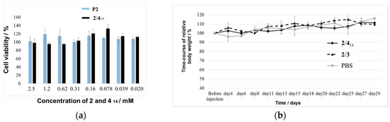 (a) In vitro cell viability of 2/414 and P2 by using the CCK-8 kit after incubation for 24 h at 37 °C under 5% CO2 and (b) in vivo toxicity of 2/414 for healthy ICR mice weight (three mice for each of 2/414, 2/3 and control PBS) as a function of time after injection of 200 μL of mixed micelles (40 mM for each component) in PBS or PBS. See the Supplementary Information for experimental details.