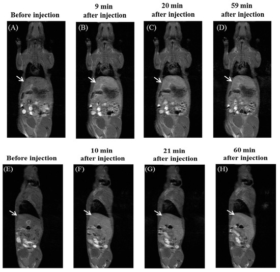 Finally, the in vivo MRI experiment using 2/414 was performed for healthy ICR mice. Bright MRI contrast enhancement was observed in the liver in both coronal and sagittal planes over 1 h with high reproducibility (Figure 7). This result reveals that the magnetic mixed micelle 2/414 is effective as an in vivo T1-weighted MRI contrast agent. The prolonged MRI enhancement observed for 2/414 is attributed to the high resistance to reducing agents as described above.