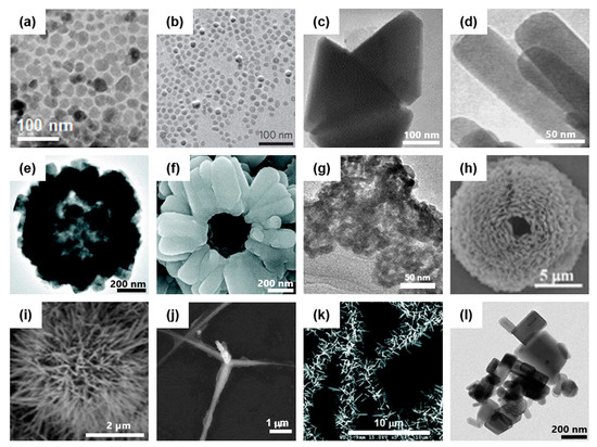Artificially-synthesized ZnO-based nanocomposites with various sizes and shapes. (a) Transmission electron microscopic (TEM) image of ZnO NPs. Reproduced from Ha et al. [7] which is licensed under a Creative Commons Attribution-(CC BY 4.0) International License (http://creativecommons.org/licenses/by/4.0/) (b) TEM image of Fe3O4-ZnO coreshell nanoparticles (NPs). Reproduced with permission from Nature [8]; [2011], Springer. (c) TEM image of ZnO prism nanocrystals. Reproduced with permission from [52]; [2007], Elsevier. (d) TEM image of ZnO nanorods. Reproduced with permission from [53]; [2015], Elsevier. (e) TEM image of a hollow sphere particle composed of ZnO nanorods. (f) Scanning electron microscopic (SEM) image of typical particle (e). Reproduced with permission from [54]; [2008], American Chemical Society. (g) TEM image of hollow ZnO nanospheres used in vivo. Reproduced with permission from [24]; [2017], John Wiley and Sons. (h) SEM image of mesoporous ZnO hollow microsphere. Reproduced with permission from [55]; [2012], Royal Society of Chemistry. (i) SEM image of spiky particle composed of ZnO nanowires (NWs) grown on SiO2 nanoparticle. Reproduced with permission from [33]; [2015], Royal Society of Chemistry. (j) SEM image of tetrapod-like ZnO nanostructure. Reproduced with permission from [46]; [2006], John Wiley and Sons. (k) SEM image of radially grown ZnO NWs on poly(l-lactic acid) (PLLA) fibers. Reproduced from Sharma et al. [26] which is licensed under a Creative Commons Attribution-(CC BY 4.0) International License (https://creativecommons.org/licenses/by-nc/3.0/). (l) TEM image of commercially available ZnO ‘Calamine’ powder.
