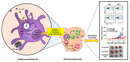 Schematic diagram of the proposed effects of ZnO nanocomposites on antigen-presenting cells and their potential role in inducing T cell responses in draining lymph node. Various forms of ZnO nanocomposites (e.g., ZnO NPs and NWs) can stimulate inflammatory responses in antigen-presenting cells via TLR recognition or direct endocytosis/phagocytosis, which subsequently initiates immune signaling cascades. TLR stimulation by ZnO nanocomposites can upregulate downstream molecules IRAK and TRAF, and enhance subsequent MAPK pathways. Then, the inhibitor of NFκB, IκB, is degraded and NFκB is activated accordingly. Endocytosed ZnO nanocomposites transported into the acidic lysosomes dissociate into Zn2+ ions and ionic form of zinc disrupts oxidative balance, increasing ROS generation. Ultimately, upregulation of pro-inflammatory signaling pathway and ROS generation enhance the production of pro-inflammatory cytokines and chemokines, and increase the surface expression of co-stimulatory and antigen presenting molecules. Stimulated antigen presenting cells migrate into draining lymph node and prime naïve CD4 and CD8 T cells into effector T cells, which can initiate both humoral and cell-mediated immune responses against specific antigen associated with ZnO nanocomposites. A representative example of anti-cancer immunity induced by ZnO nanocomposites coated with a tumor antigen, carcinoembryonic antigen (CEA), is presented in the right panel (Reproduced from Sharma et al. [26] which is licensed under a Creative Commons Attribution-(CC BY 4.0) International License (https://creativecommons.org/licenses/by-nc/3.0/).). NP: nanoparticle, NW: nanowire, TLR: Toll-like receptor, MyD88: myeloid differentiation primary response protein-88, IRAK: IL-1 receptor associated kinase, TRAF: TNFR-associated factor, MAPK: mitogen-activated protein kinase pathway, NFκB: nuclear factor κ chain enhancer of activated B cells, IκB: inhibitor of κB, AP-1: activator protein 1, ROS: reactive oxygen species.