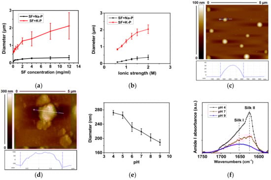 Effects of SF concentration, salt, ionic strength and solution pH to the particle size and protein secondary structure. (a) Particle diameter as a function of SF concentration when adding SF solutions (concentration from 0.1–12 mg/mL) to sodium phosphate (Na-P) and potassium phosphate (K-P) solutions (both at ionic strength 1.25 M, pH 8) at the volume ratio of 1:5. (b) Diameter of SF particles fabricated with K-P or Na-P as a function of their ionic strength. The SF concentration was fixed at 5 mg/mL. (c-d) AFM images of particles fabricated by adding SF solution (12 mg/mL) in to sodium phosphate (c) and potassium phosphate (d). Both solutions are at the ionic strength of 1.25 M and pH 8. (e) Diameter of SF particles fabricated with Na-P as a function of the Na-P solution pH. (f) FTIR spectra of particles produced by 1.25 M sodium phosphate at different pH values. It was found that the use of sodium phosphate, lower ionic strength and higher pH of solution produces smaller SF particles. Reprinted from Reference [43]; with permission from American Chemical Society [2017].