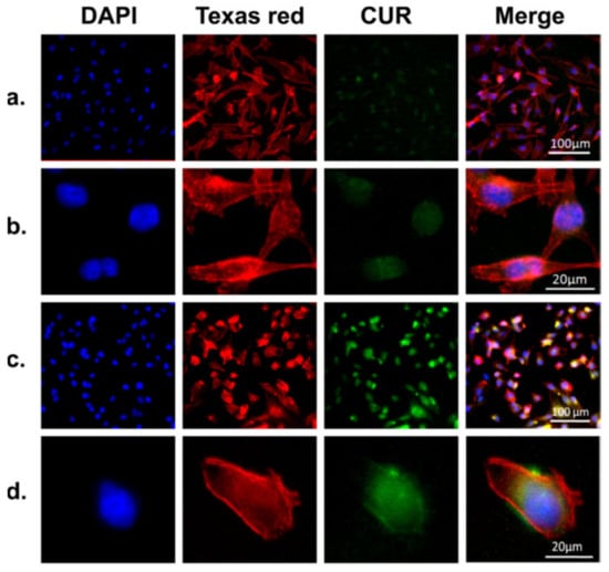 Representative microscopic images of MDA-MB-231 cells incubated with free curcumin ((a) and (b), curcumin amount (10 μg/mL), equivalent to the curcumin amount in CMSPs (curcumin loaded magnetic SF core−shell nanoparticles) and CMSPs ((c) and (d), 30 μg/mL) for 4 h. The cell nucleus and cytoskeleton were stained with DAPI (blue) and Texas red (red); all images were taken with an AF6000 microscope (Leica). Comparing the images in (a) and (b) to (c) and (d), it can be seen that CMSPs significantly improve the cellular uptake of the curcumin. Reprinted from Reference [43] with permission from the American Chemical Society [2017].