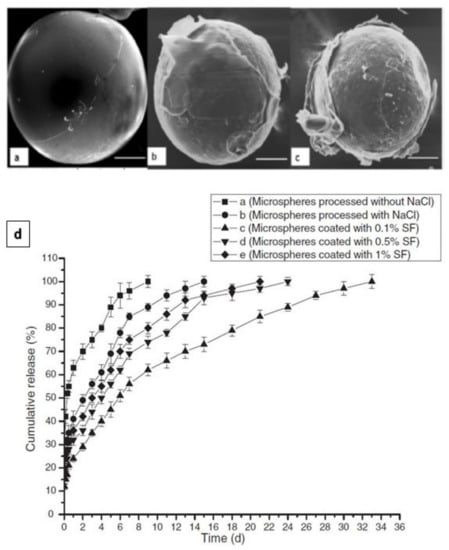 SF, as a biopolymer, can be processed in aqueous conditions and crosslinked by different methods. Therefore, SF solution has been utilised for single or multilayer coating of different pharmaceutical preparations. In a study conducted by Pritchard et al. [97], the adenosine release from SF encapsulated powder reservoirs was evaluated as a function of reservoir coating thickness. The coating thickness was varied by changing the concentration of the silk coating solution and the number of coating layers applied. Increasing the coating thickness or the crystallinity of the SF delayed adenosine burst, decreased average release rate, and increased the duration of release [97]. Eliminating infections by releasing antibiotics such as vancomycin from biodegradable microspheres is a very effective strategy. However, maintaining the antibiotic concentration within the therapeutic window over the required treatment time remains a challenge [98]. A recent study has addressed this challenge by coating vancomycin-loaded poly(ε-caprolactone) (PCL) microspheres with SF to reduce the burst release of vancomycin [98]. The PCL microspheres were prepared by double emulsion (W1/O/W2) solvent evaporation/extraction process and the coating was performed by suspending the microspheres in the SF coating solutions (0.1%, 0.5% or 1%). Methanol was used to induce SF transformation from α-helix to β-sheet [98]. The microspheres coated with 0.1% SF showed smooth surface and presented a better release profile. By increasing the SF concentration, more cracks and defects were detected (Figure 6) [98].