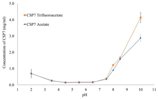 The solubility of CSP7 acetate and CSP7 TFA was determined between pH 2 and pH 10, and is shown in Figure 1. The solubility of CSP7 acetate at pH 2 was 0.701 ± 0.153 mg·mL−1 and it continuously decreased to 0.241 ± 0.007 mg·mL−1 (p < 0.05) at pH 3.5, and 0.160 ± 0.003 mg·mL−1 (p < 0.05) at pH 4.5 as the pH increases. Between pH 4.5 and 6.5, the solubility of CSP7 acetate increased slightly, and it was 0.174 ± 0.016 mg·mL−1 at pH 5.5, and 0.178 ± 0.013 mg·mL−1 at pH 6.5. As pH was increased, the solubility of CSP7 acetate increased to 0.347 ± 0.014 mg·mL−1 at pH 7.5, and it increased between pH 7.5 and pH 10.0 (2.880 ± 0.201 mg·mL−1).