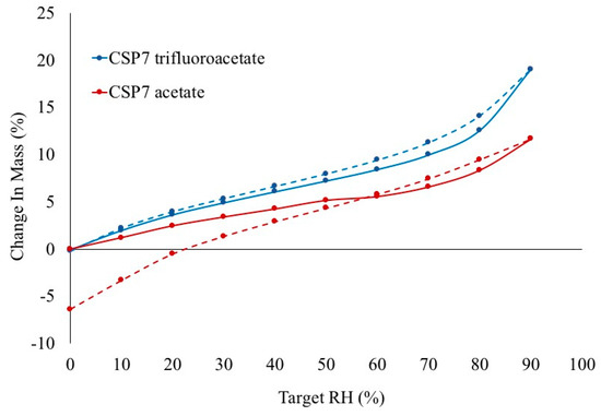 The moisture sorption of different salt forms of CSP7 were compared. Figure 2 shows the water sorption-desorption isotherm of CSP7 acetate and CSP7 TFA. CSP7 acetate and CSP7 TFA were crystalline in unprocessed powder form. Crystalline materials are less prone to absorb water since they can only adsorb water at the surface, while amorphous materials can also absorb water at the surface and allow water to diffuse through the material [29]. The moisture sorption isotherm of CSP7 acetate showed a decrease in mass change at 60% RH. This indicates that the small amount of amorphous in CSP7 acetate recrystallized and exhibited less moisture sorption after recrystallization at 60% RH. In contrast, CSP7 TFA exhibited constant bulk material weight during both sorption and desorption, which confirms that no change occurred in the physical state of CSP7 TFA after exposure to 75% RH. Additionally, the moisture desorption isotherm of CSP7 acetate showed a 6.36% decrease in weight compared to its initial weight, while the moisture desorption isotherm of CSP7 TFA showed no change in weight. These results indicate that moisture induced the loss of mass from the CSP7 acetate bulk powder.