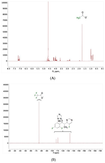 NMR spectrums of bulk powder: (A) 1H-NMR spectrum of CSP7 acetate; (B) 19F-NMR spectrum of CSP7 TFA.
