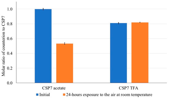 The presence of counterions in the bulk material and powder after exposure to air was analyzed using solution NMR. As shown in Figure 3A, the peak of acetate was observed at 1.75 ppm in the 1H- NMR spectrum. The peak of trifluoromethyl (CF3) was observed at −75 ppm in the 19F-NMR spectrum (Figure 3B). The molar ratio of counterions to CSP7 was calculated as described in Section 2.15 above. In the bulk material, the molar ratio of acetate to CSP7 was 1:1, while the molar ratio of TFA to CSP7 was 0.81:1 (Figure 4). After 24 h of exposure to air at room temperature, the molar ratios of acetate to CSP7 in the bulk CSP7 acetate was 0.53:1, while the molar ratio of TFA to CSP7 in the bulk CSP7 TFA remained 0.82:1 after 24 h exposure to air at room temperature.