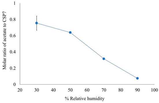 Molar ratio of acetate to CSP7 in bulk material after exposure to different humidity levels.