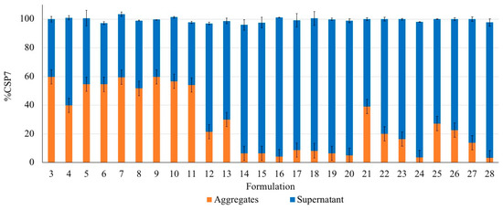 Lyophilized formulations of CSP7 acetate formulated with a bulking agent (i.e., lactose, trehalose, or mannitol) buffer (DPBS/TBS) and ammonium hydroxide were prepared. Lyophilized samples were resealed and incubated at 25 °C and 75% RH for 12 h. The samples were reconstituted with SWI at 0.5 mg·mL−1. The reconstituted solutions were investigated for aggregation. The samples were centrifuged at 12,000 rpm for 15 min. The supernatant and aggregates were collected separately. Peptide aggregates were re-dissolved by adding a small amount of ammonium hydroxide (<1% v/v). The recovery of CSP7 in the supernatant and aggregates were analyzed using HPLC.