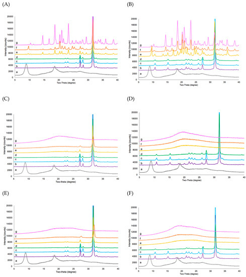 X-ray powder diffraction (XRD) was recorded using a benchtop X-ray diffraction instrument, model Miniflex 600 (Rigaku, Woodlands, TX, USA), with primary monochromated radiation (Cu K radiation source, λ = 1.54056 Å). The instrument was operated at an accelerating voltage of 40 kV at 15 mA. Samples were loaded in the sample holder and scanned in the range of 5–40 Å of 2θ at a scan speed of 1 °C·min−1, a step size of 0.04 °C·s−1, and a dwell time of 2 s.