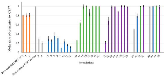 We determined the molar ratio of counterions to CSP7 in the lyophilized formulations containing different pH modifiers, buffers, and bulking agents. We achieved this using solution NMR as described in Section 2.14 above. We also investigated the molar ratios of counterions to CSP7 in lyophilized CSP7 acetate and lyophilized CSP7 TFA after 1 month and 3 months storage at 25 °C/60% RH and after 6 months storage at 5 °C. Additionally, the molar ratios of acetate to CSP7 were determined in lyophilized formulations containing different concentrations of acetic acid (7%, 14%, and 21% v/v). Furthermore, the molar ratio of acetate to CSP7 in CSP7 acetate unprocessed powder was determined after exposure to the air and exposure to different humidity including 30% RH, 50% RH, 70% RH, and 90% RH.