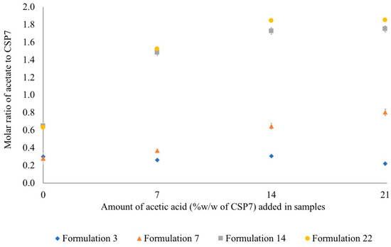Molar ratio of acetate to CSP7 after exposure to air at room temperature.