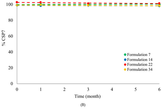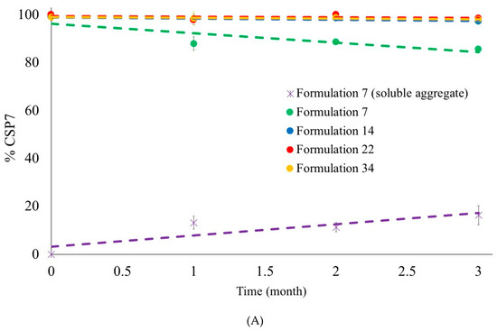 Moisture has a detrimental effect on the stability of proteins and peptides because it dramatically increases their mobility [51]. As a result, the peptide is likely to agglomerate, followed by peptide aggregation [51]. Levels of aggregates in lyophilized CSP7-lactose and CSP7-trehalose formulations after exposure to 75% RH were lower than lyophilized CSP7-mannitol (Figure 8). Additionally, Formulation 7 was physically unstable after one month of storage at 25 °C/60% RH, while Formulations 14 and 22 were stable after storage at 25 °C/60% RH up to three months. These results indicate that lactose and trehalose have greater stabilizing effects than mannitol.