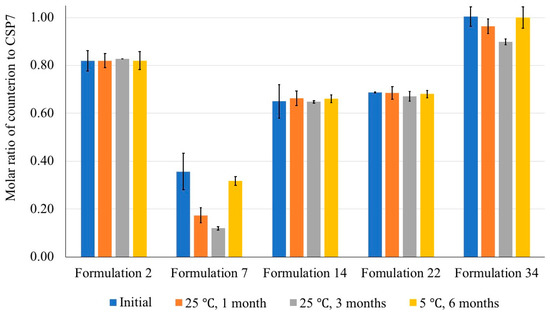 Different types of bulking agent and different molar ratios of CSP7 to the bulking agent affect the presence of acetate counterions in the lyophilized samples. We found that lactose and trehalose can preserve acetate counterions during lyophilization. A higher content of lactose and trehalose resulted in higher molar ratios of acetate to CSP7 in lyophilized CSP7 acetate. Moreover, there was no change in the molar ratio of acetate to CSP7 in lyophilized CSP7-lactose (Formulation 14) and CSP7-trehalose (Formulation 22) after storage at 25 °C/60% RH, and 5 °C, while lyophilized CSP7-mannitol (Formulations 7 and 34) showed a decrease in the molar ratio of acetate to CSP7 after storage at 25 °C/60% RH (Figure 13).