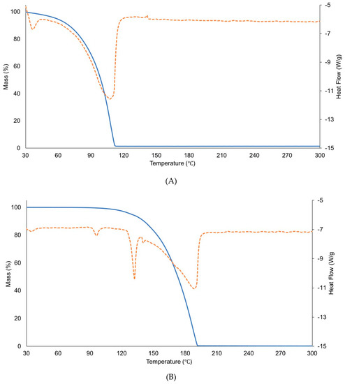 Thermogravimetric Analysis (TGA) was performed for ammonium acetate and ammonium TFA using a TA Thermogravimetric Analyzer Q500 (TA, Instruments, New Castle, DE, USA). Standard aluminum pans were filled with about 5–7 mg of powder. Temperature ramp experiments were performed from 30 °C to 300 °C at a rate of 5 °C·min−1 with a nitrogen purge at 50 mL·min−1.