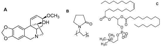 The chemical structure of (A) haemanthamine (HAE), (B) polyvinylpyrrolidone (PVP) and (C) phosphatidylcholine (PC).