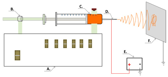 The electrospinning (ES) setup for generating nanofibrous templates for self-assembled liposomes of HAE. Key: (A) A robotized ES system; (B) programmable syringe pump; (C) polymer solution; (D) spinneret (a needle system); (E) high-voltage power supply; (F) collector plate.