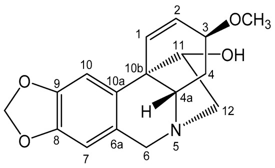 Since the plant-origin active agent used in our study (HAE) was isolated from Zephyranthes ajax Hort. belonging to the family Amaryllidaceae in Vietnam, the chemical structure of the present alkaloid was verified by means of NMR spectroscopy. The results are summarized in Figure 3 and in the text below.