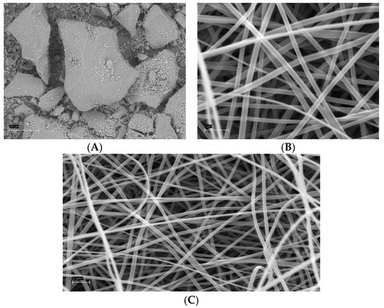 The SEMs of an isolated and milled HAE powder (A) and the amphiphilic electrospun NFs (B,C) used as a solid template for the self-assembled liposomes. Scale bar 200 µm (A) and 2.0 µm (B,C).