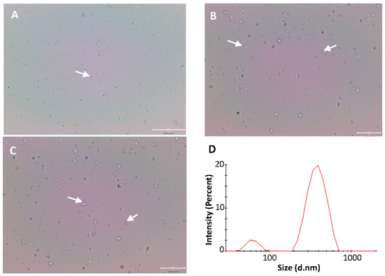 The optical microscopy images (A–C) and the PCS size and size distribution (D) of the self-assembled liposomes in purified water. The liposomes consisting of soybean PC and HAE are spontaneously dispersed from the electrospun amphiphilic nanofibrous template. Due to the limited magnification (50×) of an optical microscope, only the liposomes composed of large vesicles can be seen. Some selected clusters of liposomes are indicated by white arrows. Scale bar 20 µm with 20× (A), and 40× (B,C).