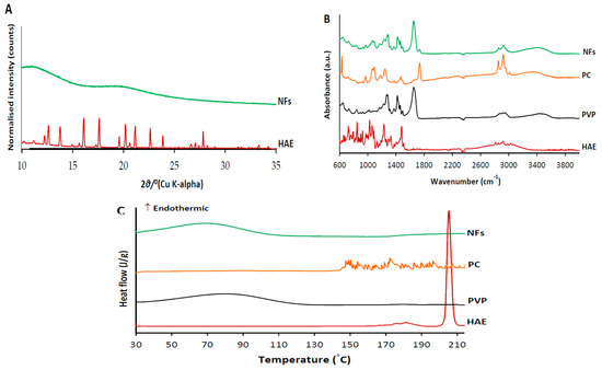 Physical solid-state analysis was conducted in order to verify potential process-induced solid-state transformations and molecular drug-polymer interactions on the course of the ES of amphiphilic NFs. The XRPD patterns, FTIR spectra and DSC thermograms of HAE (as a powder form) and HAE-loaded amphiphilic electrospun NFs are shown in Figure 6. The XRPD pattern of a pure active agent (HAE) exhibits numerous distinct reflections characteristics to its crystalline nature. The most predominant diffraction peaks of HAE are shown at 12.2, 12.6, 13.8, 16.1, 17.6, 19.6, 20.2, 21.1, 22.6, 23.8 and 27.8°2θ (Figure 6A). The XRPD pattern for the HAE-loaded electrospun NFs with two broad amorphous halos indicates most likely an amorphous state of the amphiphilic NFs (Figure 6A). However, the low drug loading in the NFs (approximately 4.5% w/w) challenges the interpretation of the present XRPD results on the solid state of HAE in the NFs. Since it is generally known that a high-energetic amorphous state fosters the dissolution of the material to water, this finding supports the molecular self-assemble strategy applied for the present nanoformulations of HAE. Our results are also in a good agreement with the findings reported by Yu at al. [8]. They found that the electrospun amphiphilic NFs of soybean PC and PVP (without HAE) are amorphous (XRD), but increasing the amount of PC in the NFs resulted in obvious phase separation (i.e., PC separates out from the PVP matrix template). The amorphous halos observed in the XRPD pattern of amphiphilic NFs are most likely contributed by PVP (Figure 6A).