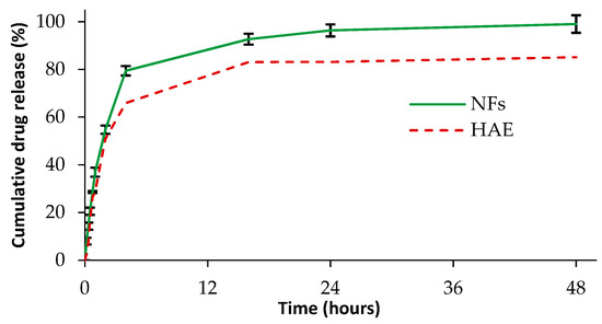 The cumulative dissolution profiles of HAE as a powder and loaded in the amphiphilic electrospun NFs are shown in Figure 7. The theoretical amount of HAE in the solid nanofibers sample applied in the dissolution test was 0.89 mg (respective to 100% in the dissolution study). With HAE as a powder, approximately 50% of active ingredient dissolved within the first 2 h and over 80% of HAE dissolved within the next 16 h (after 18 h the dissolution reached the plateau). The release of HAE from the amphiphilic electrospun NFs and self-assembled liposomes occurred in three phases: More than 50% of HAE released within the first 2 h, approximately 80% released within the next 2 h, and the rest of the active agent (100%) released within 30 h (Figure 7). The initial burst release of the drug-loaded amphiphilic nanofibers could be attributed to the surface or near-surface distribution of HAE in the nanofibers and the physical solid state of HAE in the nanofibrous templates. The XRPD results (Figure 6A) suggested that HAE is distributed in an amorphous form in the electrospun nanofibers, thus showing the success of the strategy. In the last phase of the dissolution, a steady-state release pattern was observed obviously due to the drug release from the self-assembled liposomes. Khan and coworkers reported the disintegration and diffusion-controlled mechanism associated with the active release from the nanofibers loaded with oregano essential oil [26]. According to Yu and coworkers, when the amphiphilic NFs are exposed to water, the PC molecules (attached in the PVP chains) are hydrated and concentrated within the nanofibrous network [8]. This results in swelling of the nanofibrous template. The self-assembled liposomes are formed as hydrated PC molecules form co-aggregates, thus entrapping water inside the vesicles. In the final stage, the self-assembled liposomes are released in the dissolution medium [8]. Our dissolution study is only indicative to compare the dissolution properties of HAE and the present amphiphilic nanofibrous templates loaded with the active agent. More research is needed to gain an understanding of the self-assembly of liposomes in the aqueous media and actual release of the active agent from the formed liposomes.