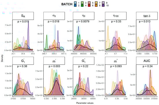Experimental distribution of each batch (coloured) and overall distribution (black) stratified by the rheological parameters considered. The p value of the Shapiro–Wilk test assesses the normality of the overall distribution. SR, relative thixotropic area; σ0, yield stress; η0, zero-shear viscosity; η100, viscosity at 100 s−1; tan δ, loss tangent at 1 Hz; , calculated elastic modulus; , calculated viscous modulus; m’ and m″ are the parameters obtained when fitting G’ and G’’, respectively, versus frequency; AUC, area under the surface versus weight curve.