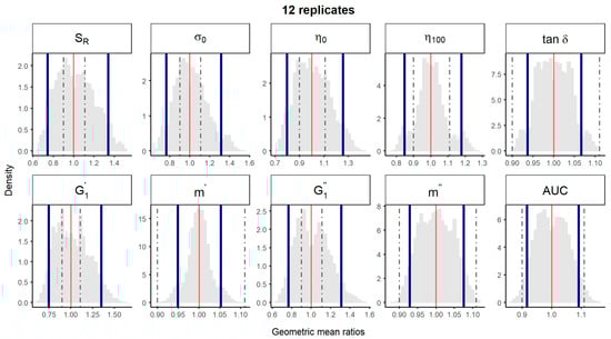 A bootstrap analysis of the physical parameters was performed using the experimental data described above. The 10,000 geometric mean ratios with 12 replicates and non-parametric 90% CI were represented, using either the “1 batch vs. 1 batch″ (Figure 2) or the “5 batches vs. 5 batches″ (Figure 3) comparison method. Non-parametric 90% CI of physical parameters tan δ, m’, m″ and spreadability laid within the ±10% limits irrespective of the method of comparison. Thus, equivalence among batches could be concluded for parameters with total variability <5%. However, for parameters with total CV between 5 and 10% (i.e., η100), equivalence could only be concluded with the “5 vs. 5″ comparison method, the probability distributions of the geometric means of the “1 vs. 1″ comparison method being notably wider (Figure 2 and Figure 3). For rheological parameters with total CV > 10% (SR, σ0, η0, and ), equivalence could not be concluded by neither the “1 vs. 1″, nor the “5 vs. 5″ method.