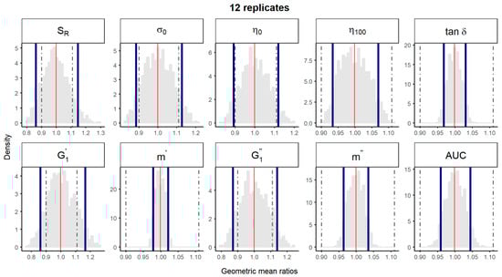 Bootstrap analysis of rheological parameters - 1 reference batch versus 1 reference batch. 10,000 geometric mean ratios (light grey area) resulting from the bootstrap analysis of “1 reference batch versus 1 test batch″ for each rheological parameter. Data of 10 batches and 12 replicate each were used. Median (red line) and non-parametric 90% CI (blue lines) of the probability distribution. Dashed lines represent the acceptance limits for equivalence (90–111.11%) stated in the EMA guideline [4]. SR, relative thixotropic area; σ0, yield stress; η0, zero-shear viscosity; η100, viscosity at 100 s−1; tan δ, loss tangent;, calculated elastic modulus; , calculated viscous modulus; m’ and m″ are the parameters obtained when fitting G’ and G’’, respectively, versus frequency; AUC, area under the surface versus weight curve (spreadability).