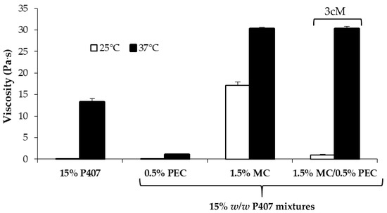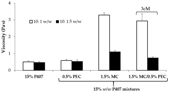 In Figure 3 viscosity values (at 5 s−1 shear rate) of 15% w/w P407 solution and its mixtures with PEC (0.5 w/w), MC (1.5% w/w) and 1.5% w/w MC/0.5% w/w PEC are compared.