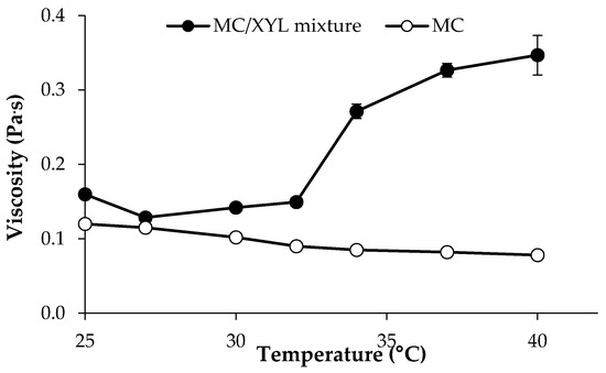 In Figure 5, viscosity vs. temperature profiles of 0.75% w/w MC/0.25% w/w XYL mixture and of the 0.75% MC solution are reported. It can be observed that XYL is able to lower MC gelation temperature, which stands around 32 °C.