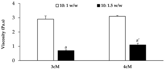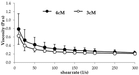 3cM and 4cM were also subjected to viscosity analyses at room temperature (25 °C) at increasing shear rates (10–300 s−1). Three replicates were effected for each sample.