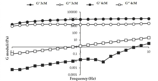 In Figure 7, storage (G′) and loss (G″) moduli vs. frequency profiles obtained at 25 °C for the two mixtures are reported. Between the two mixtures, 3cM shows, at room temperature, greater elastic properties than 4cM. Whereas for 4cM mixture the viscous component overcomes the elastic one, 3cM mixture is characterized by a prevalence of the elastic behavior over the viscous one. For an easy administration, it is preferable that the viscous contribution is prevalent on the elastic one, i.e., the energy imparted to the sample during administration is mainly used to flow and not to recover the undergone deformation [38].